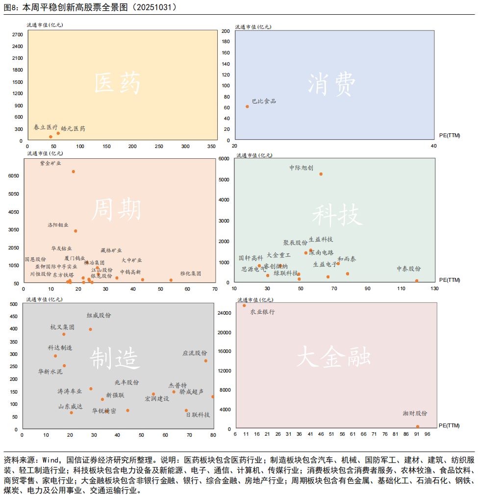 我们根据分析师关注度、股价相对强弱、趋势延续性、股价路径平稳性、创新高持续性等角度,本周从全市场创新高股票中筛选出了包含香农芯创、源杰科技、生益电子等50只平稳创新高的股票。按照板块来看,创新高股票数量最多的是周期、制造板块,分别有16、15只入选。其中,周期板块中创新高最多的是有色金属行业;制造板块中创新高最多的是机械行业。