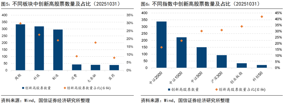按照板块分布来看,本周周期、科技、制造、消费、大金融、医药板块创新高股票分别有334、319、296、43、40、39只,数量占板块股票数量比例分别为:29.79%、22.64%、19.02%、8.94%、17.62%、7.98%。按照指数分布来看,中证2000、中证1000、中证500、沪深300、创业板指、科创50指数中创新高个股数量分别有338、223、151、93、34、21只,数量占指数成份股个数比例分别为:16.90%、22.30%、30.20%、31.00%、34.00%、42.00%。