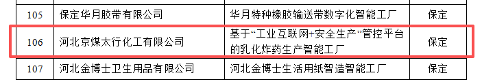 近日,河北省工业和信息化厅正式公布2025年度第二批先进级智能工厂名单,河北京煤太行化工有限公司(以下简称“京煤太行公司”)“基于‘工业互联网+安全生产’管控平台的乳化炸药生产智能工厂”项目成功入选,标志着其在民爆行业智能化转型与安全生产协同发展领域取得重要突破。