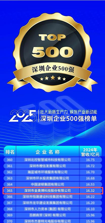 10月28日,深圳市企业联合会、深圳市企业家协会正式发布“2025深圳企业500强”系列榜单及《2025深圳500强企业发展报告》,深圳市金奥博科技股份有限公司(以下简称“金奥博”)凭借稳健的经营实力与持续的创新突破荣登榜单,这是自榜单设立以来金奥博连续八年获此殊荣,充分展现了其在深圳经济高质量发展中的卓越贡献与行业标杆地位。