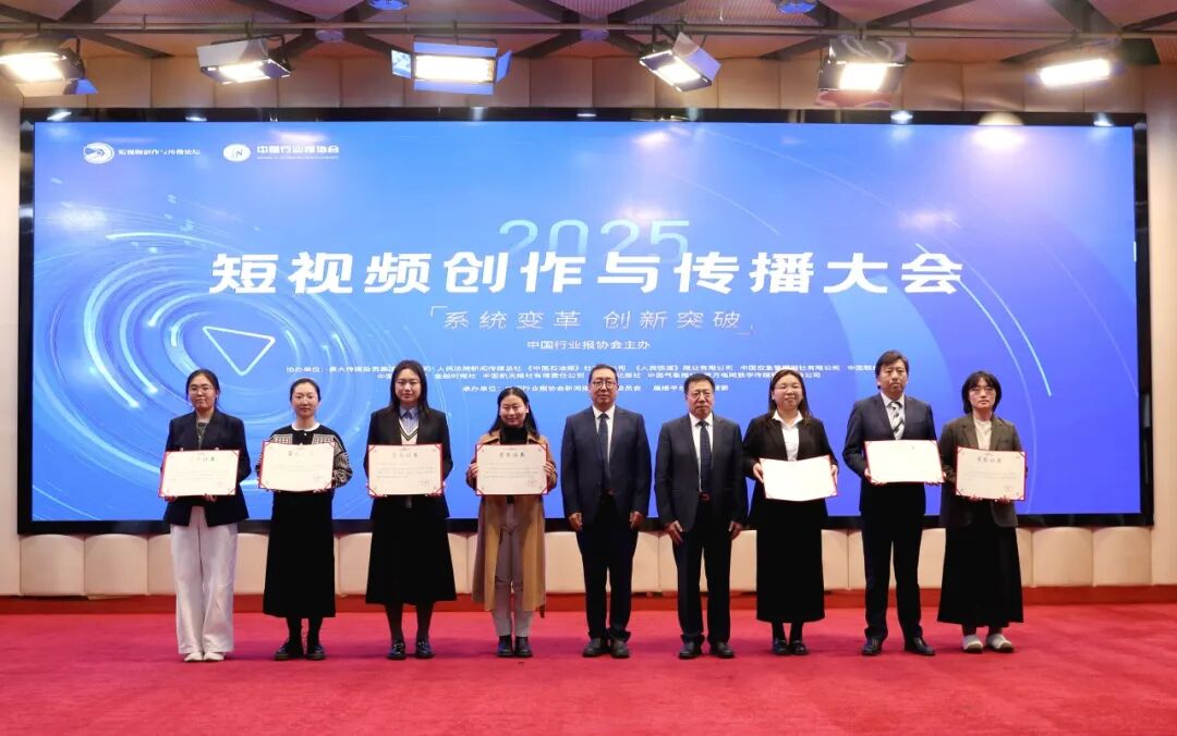 中国行业报协会会长张超文(右五),中国行业报协会驻会副会长孙福会(左五)向2025行业媒体短视频大赛一等奖获奖代表颁发证书。董芳忠/摄
