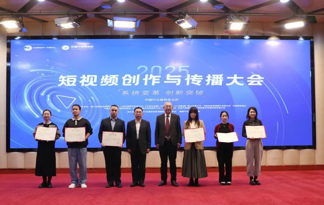 中国行业报协会会长张超文(右四),中国行业报协会驻会副会长孙福会(左五)向2025行业媒体短视频大赛一等奖获奖代表颁发证书。董芳忠/摄