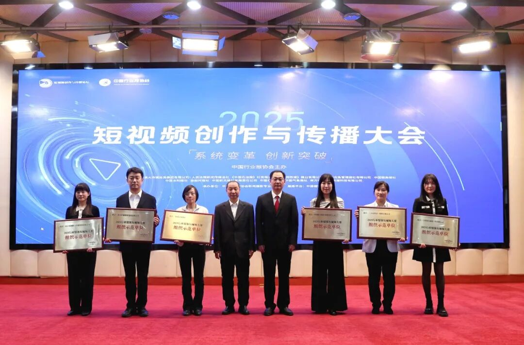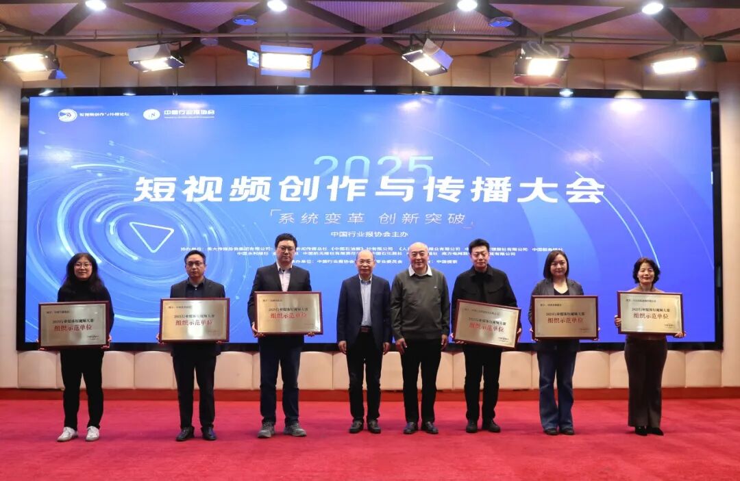 中国石化报社社长、总编辑杨守娟(右五),中国税务报社党委书记、社长付树林(左四)向2025行业媒体短视频大赛二等奖获奖代表颁发证书。董芳忠/摄