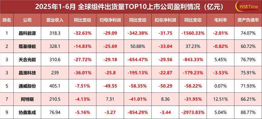 参考光伏Time此前统计的TOP10光伏组件上市公司1-6月盈利状况。唯一一家实现盈利的TOP10龙头阿特斯,作为七家上市公司之中营收倒数第二名的二线组件厂商,毛利率却足有堪称惊艳的12.51%。