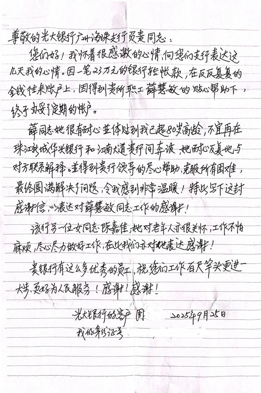 10月21日,光大银行广州海珠支行收到了一封特殊的感谢信。这封信出自一位80多岁的客户之手,字里行间满是对支行员工的感激与认可,也彰显了支行员工优质服务的温度与担当。