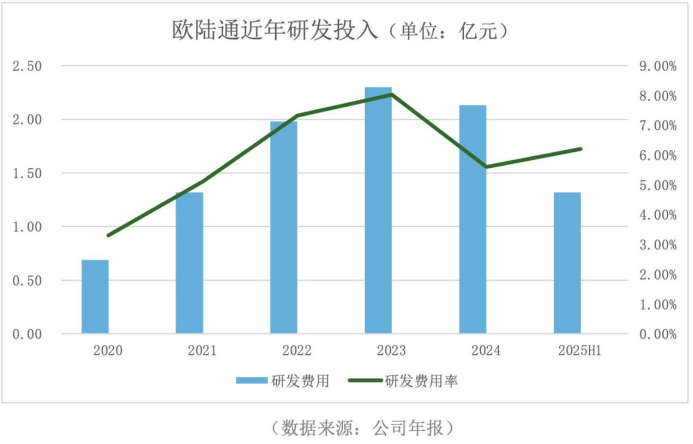 为把握发展机遇,打造企业的“护城河”,近年欧陆通尤为重视研发投入。公司2020-2023年期间持续加码,研发费用率从3.31%升至8.02%;2024年虽略有下降,但2025年上半年研发费用增长28.26%,研发费用率提升至6.21%。在2025年第三季度,欧陆通研发费用达到2.11亿元,同比增幅达38.31%。