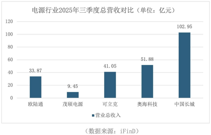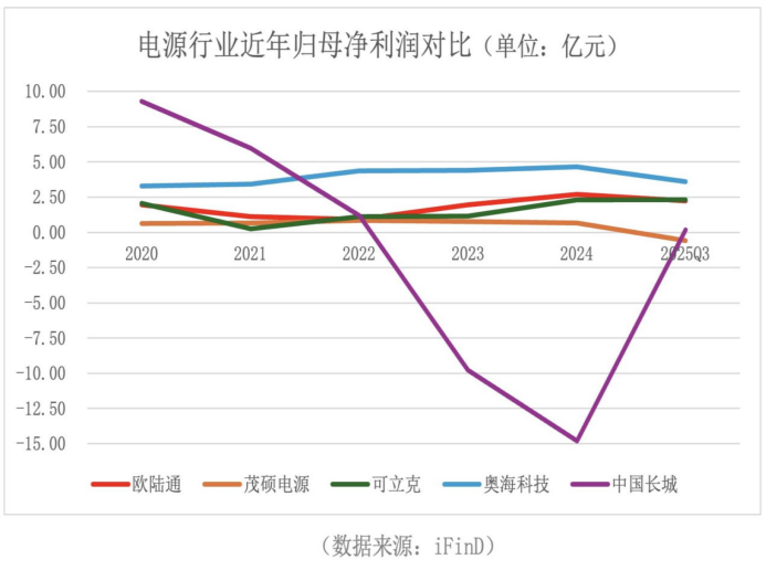 在电源行业,欧陆通总市值仅为业内第8位,公司实际上面临着不小的发展压力。2025年前三季度,在选取的5家行业内主要上市企业中,欧陆通排在第4位。