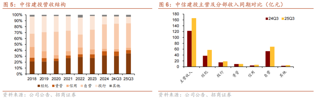 总体概览:经纪信用反弹、投行持续回暖。25Q3公司实现营业收入173亿,同比+31%,归母净利润71亿,同比+65%;单三季度营业收入65亿,同比+55%,环比+13%,归母净利润26亿,同比+79%,环比-3%。截至25Q3,公司总资产6628亿,较年初+17%,归母净资产1158亿,较年初+9%。年化ROE为10.7%,较24年+2.4pct;经营杠杆为4.44倍,边际提升。自营/经纪/投行/资管/信用/其他收入占主营收入比重分别为41%/35%/11%/6%/4%/3%,同比分别为-2/+4/-1/-2/+0/+1pct。