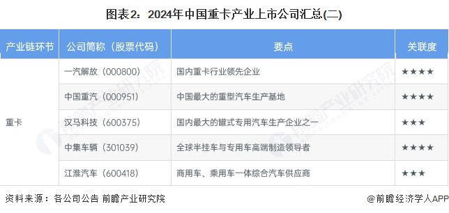 行业主要上市公司:一汽解放(600436)、中国重汽(000951)、江淮汽车(600418)、中集车辆(301039)等