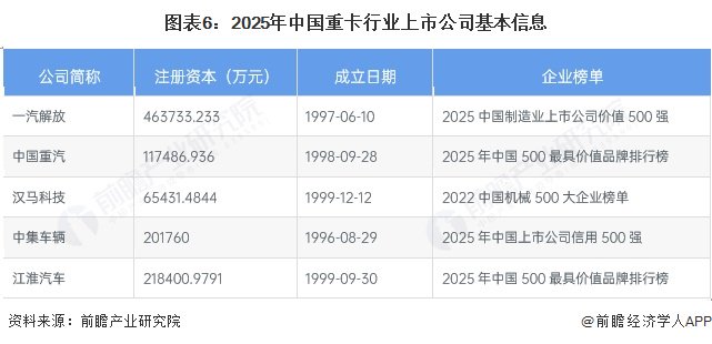 从重卡行业的上市企业布局和已有公开信息分析,注册资本最多的是一汽解放,其次是江淮汽车;成立时间最早的是中集车辆,其次是一汽解放。