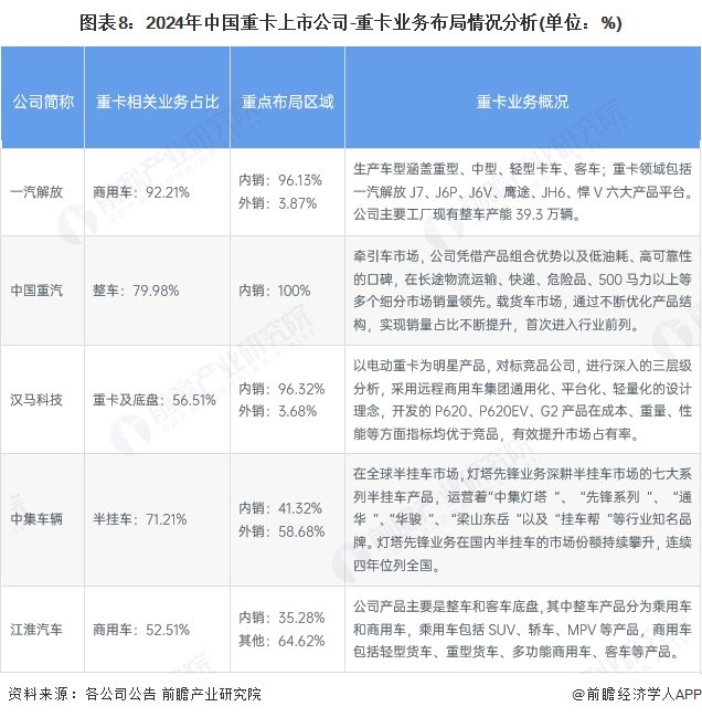 重卡行业的上市公司中,目前重卡行业上市企业中,一汽解放、中国重汽重卡相关业务占比相对较高;中集车辆海外业务占比相对较大,其余企业主要以国内市场为主。