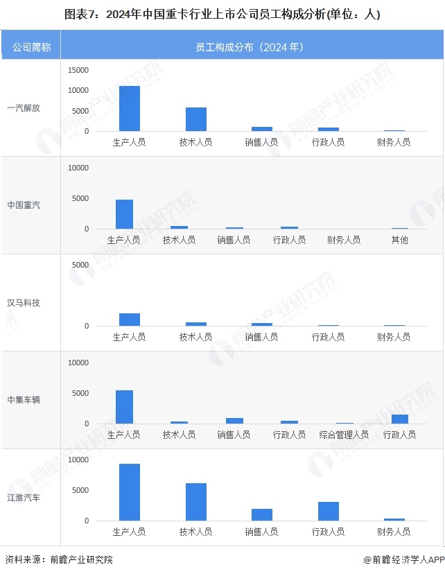 从重卡行业的上市企业已有的公开信息分析,员工总数最多的企业是江淮汽车,员工总数为21408人;技术人员相对最多的有江淮汽车和一汽解放,技术人员分别为6240人和6044人;重卡上市公司员工规模相对较多。
