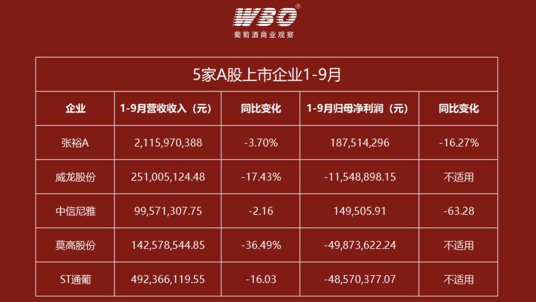 1-9月仅张裕和中信尼雅盈利,其余三家亏损共超1亿元