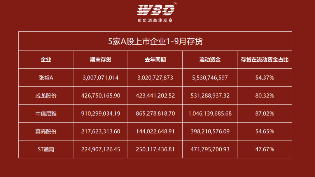 在此背景下,葡萄酒上市公司库存水平也仍居高位。5家企业期末合计存货达47.87亿元,同比上升1.8%。其中有两家企业的库存占流动资产比例超过80%,面临较大现金流压力及库存贬值风险。
