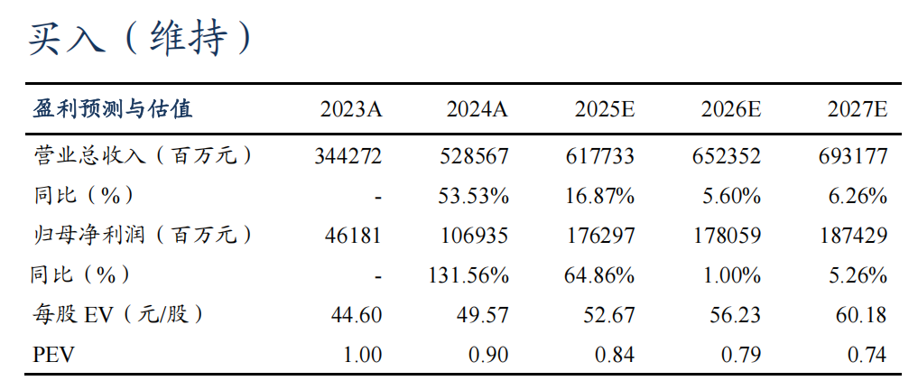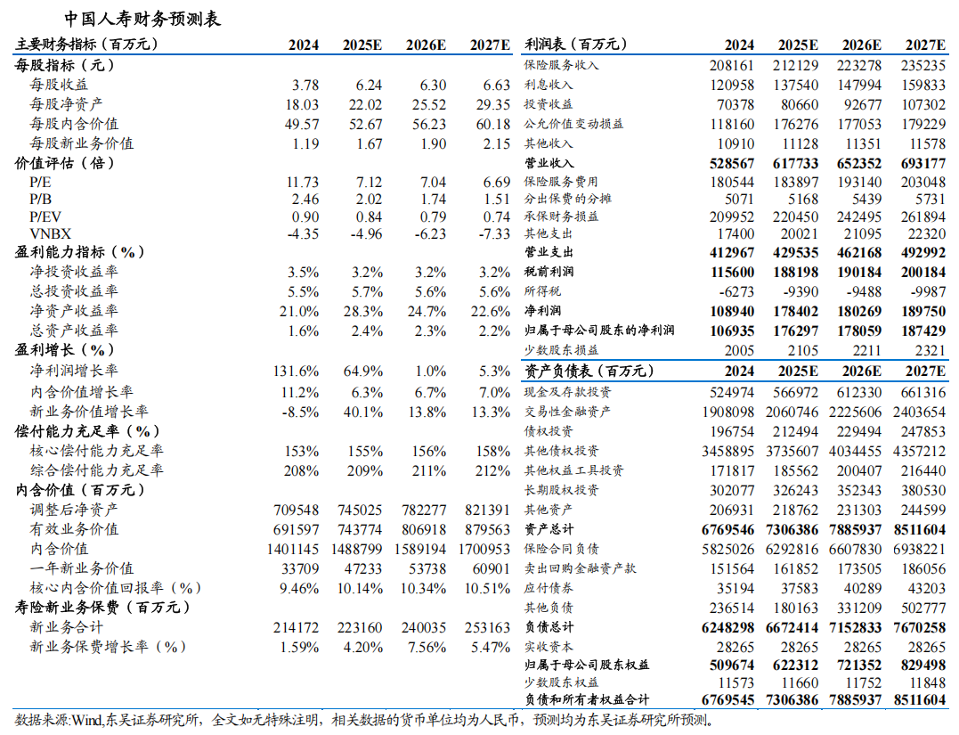 盈利预测与投资评级:我们看好公司作为寿险行业龙头的竞争优势,预计伴随公司个险营销转型的深入推进,队伍质态和业绩表现将进一步提升。我们维持此前盈利预测,预计公司2025-2027年归母净利润分别为1763/1781/1874亿元,当前市值对应2025E PEV 0.8x、PB 2.0x,维持“买入”评级。