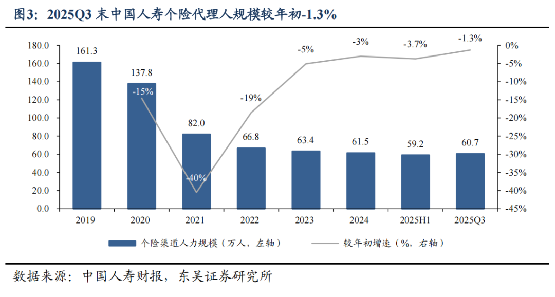 人力:人力规模环比提升,队伍质态继续改善。2024末、2025H1、2025Q3个险人力分别为61.5万人、59.2万人、60.7万人,Q3末人力较年初-1.3%,较年中+2.5%。公司人力队伍规模继续稳居行业首位,优增优育取得实效,优增人力、留存率同比提升明显。