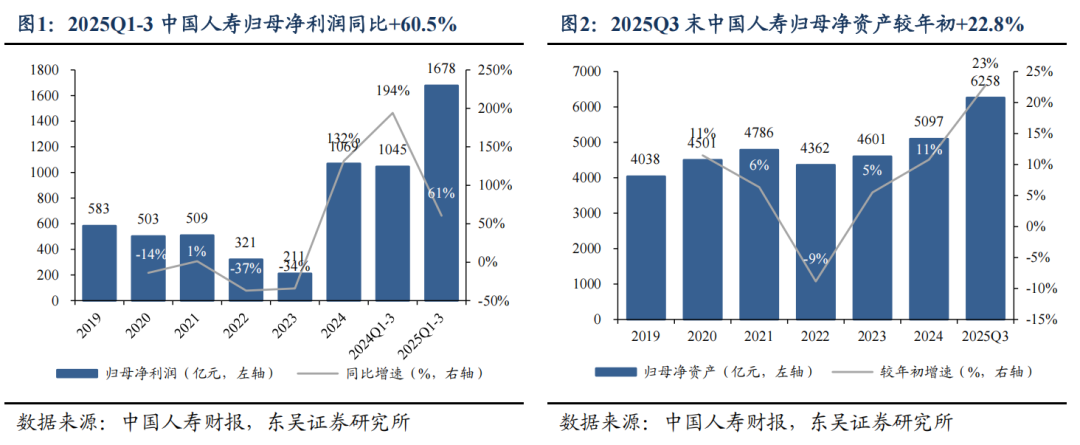 事件:中国人寿发布2025年三季度业绩:1)前三季度归母净利润1678亿元,同比+60.5%,Q3单季1269亿元,同比+91.5%,再创单季利润规模历史新高。2)Q3末归母净资产6258亿元,较年初+22.8%,较年中+19.5%,预计主要受Q3净利润高增与利率上行影响。3)可比口径下NBV前三季度同比+41.8%。