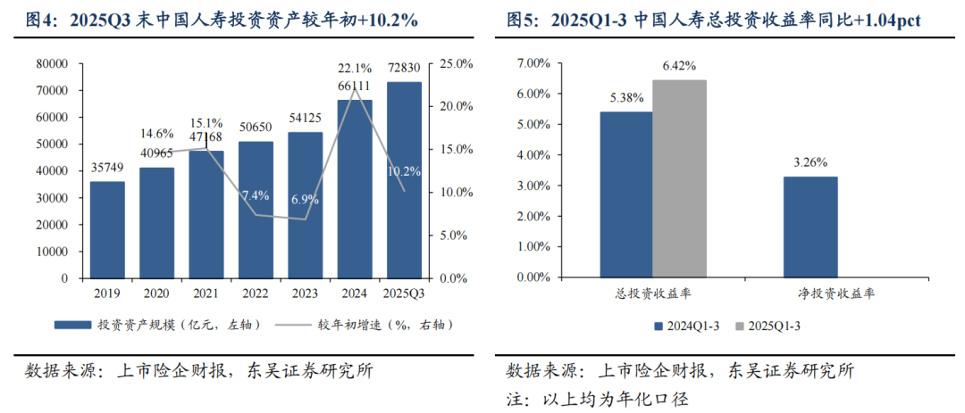 投资:权益投资弹性凸显,投资收益大幅提升。1)Q3末投资资产达规模7.28万亿元,较年初+10.2%。2)公司加大权益投资力度,在市场上涨中收益显著提升。前三季度总投资收益达到3686亿元,同比+41%,Q3单季为2410亿元,同比+73%。前三季度年化总投资收益率6.42%,同比+1.04pct。