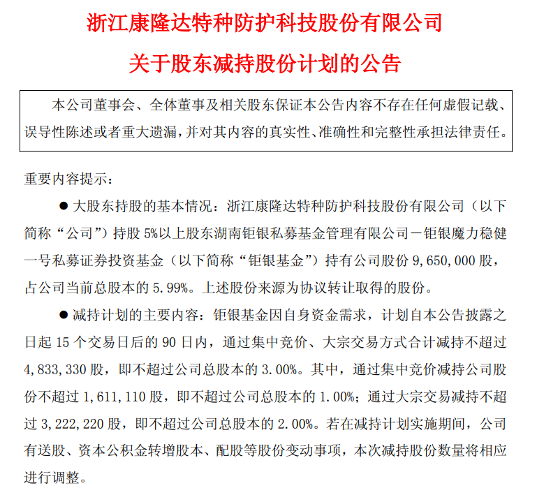10月31日,康隆达(603665.SH)发布公告,钜银基金因自身资金需求,计划自公告披露之日起15个交易日后的90日内,通过集中竞价、大宗交易方式合计减持不超过483.33万股,即不超过公司总股本的3%。
