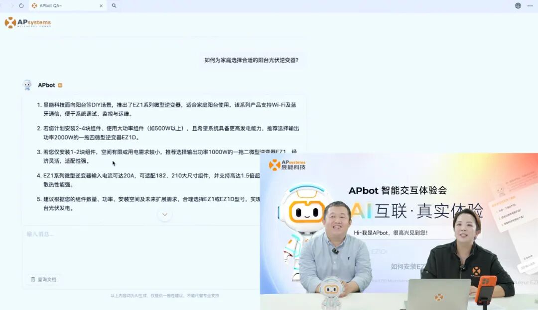 你好光伏创始人张鹏龙作为APbot的首席体验官,从光伏行业媒体人及一线用户的视角,现场操作演示,向APbot提出一系列问题,从什么是阳台光伏的概念定义、如何进行微型逆变器的设备选型,到光伏防逆流设置、APP与逆变器连接以及光伏项目方案设计的专业问题,再到光伏市场发展情况查询等市场洞察问题,APbot都能轻松解答,给出满意答案,充分展现了其作为智能光伏顾问的深度和能力。直播期间,评论区弹幕互动踊跃,分享各自的使用经历或提出新问题,主持人与做客嘉宾面向观众提出的问题,并给予了及时、专业的在线解答。