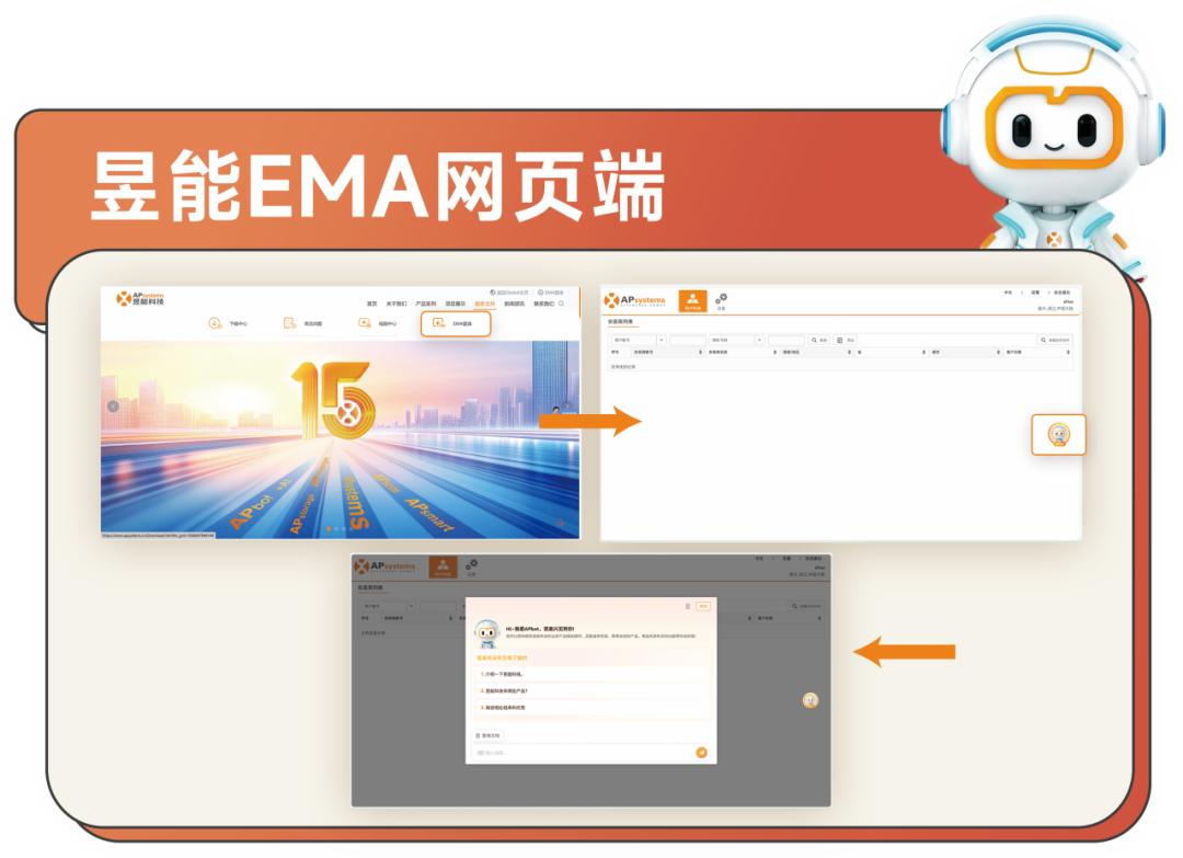 此外,在使用APbot智能助手时,用户还可以从以下多个便捷通道进入:一是在昱能科技公众号底部的菜单栏,点击【服务支持】,就能看到【APbot智能助手】,点击进入即可;二是在微信搜索“昱能昱电宝”小程序,打开小程序后,在页面首页点击【联系客服】,选择【APbot智能助手】;三是对于已经购买昱能产品并且注册过EMA账号的朋友,可在EMA网页端登录,并在页面右侧中间位置,找到【APbot智能助手】。