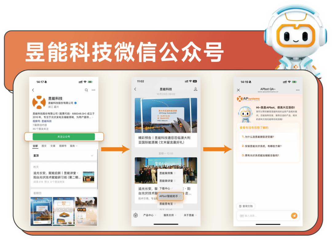 APbot是昱能科技自主研发、基于RAG与大语言模型的智能客服平台,提供聊天机器人、文档查询等功能,主要解决昱能科技产品相关的咨询问题,包括产品信息、安装指导、技术参数、运维支持等。APbot智能助手还具备五大核心特点,助力光伏行业实现效率跃升与服务焕新: