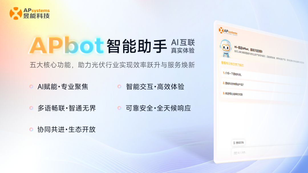 第一,APbot具备AI赋能、专业聚焦特点,APbot聚焦光伏垂直领域,构建起覆盖售前、安装、运维全业务链的专属知识库,能够精准匹配行业专业需求;第二,提供智能交互与高效体验,依托先进大模型,可精准洞察用户意图,实现丝滑连续对话,并且内嵌高性能文档搜索引擎,实现手册、技术资料等秒级响应;第三,支持多语畅联、智通无界,可多语言交互,消除沟通壁垒,同时还可智能推荐关联知识与实操视频,打破信息孤岛;第四,具备可靠安全、全天候响应优势,提供7×24小时全天候服务,随时随地响应需求,并且严格遵循信息安全规范,确保客户数据安全与隐私;第五,具备协同共进、生态开放的特点,APbot与昱能昱电宝小程序同步上线,协同赋能光伏业务场景,且平台全面对外开放,所有合作伙伴和用户均可体验。