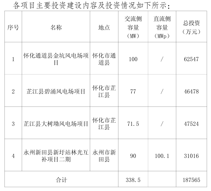 公告披露,华银电力拟投资建设怀化通道县金坑风电场项目、芷江县碧涌风电场项目、芷江县大树坳风电场项目、永州新田县新圩站林光互补项目二期,上述4个项目装机容量共计338.5兆瓦,项目总投资额约为187,565万元。其中3个风电项目总装机容量共计248.5兆瓦。