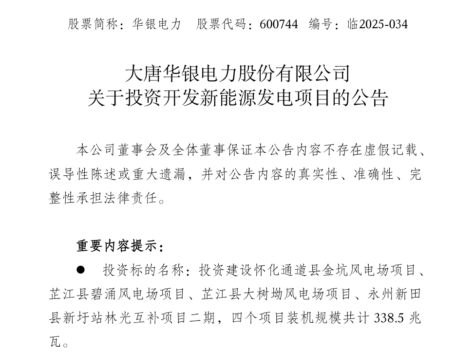 10月31日,大唐华银电力股份有限公司(以下简称“华银电力”或“公司”)发布《关于投资开发新能源发电项目的公告》。