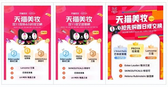 “双十一”预售期虽然结束不久,但美妆赛道的鏖战态势不减。其中,国货美妆公司珀莱雅旗下品牌矩阵,已频频登上主流电商平台的核心热榜榜首。例如在近日发布的《天猫美妆抢先购首日成交榜》《天猫美妆双11现货4小时成交榜》《天猫美妆双11成交进度榜》中,珀莱雅主品牌三榜均蝉联第一。事实上,珀莱雅已经连续两年夺得天猫美妆“双11”终榜冠军,鉴于目前珀莱雅强劲的扫榜态势,行业预测珀莱雅有很大希望实现“三连冠”。