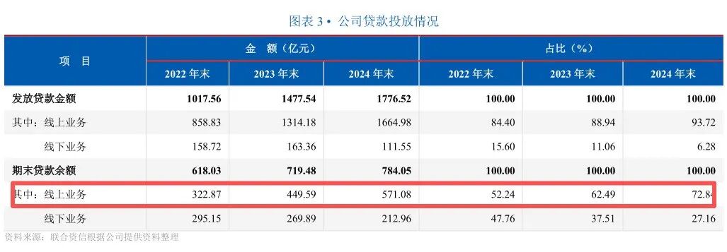 数据显示,2022年-2024年公司的贷款余额分别为618.03亿元、719.48亿元及784.05亿元。其中,2022年-2024年年末线上业务占比为52.24%、62.49%及72.84%。