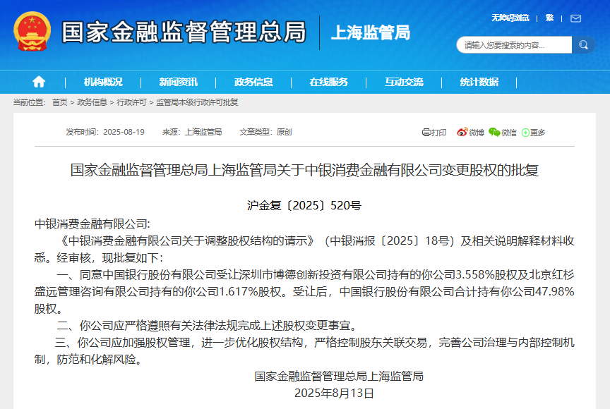 受让后,中国银行合计持有中银消费金融47.98%股权。