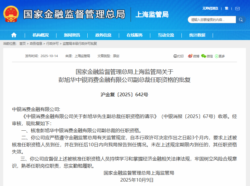 10月14日,国家金融监督管理总局上海监管局官网显示,彭旭华中银消费金融副总裁的任职资格已被核准批复。