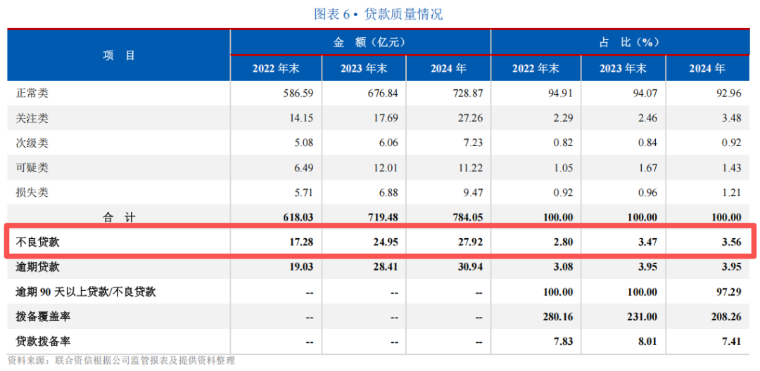 数据显示,2022年-2024年其不良贷款金额分别为17.28亿元、24.95亿元、27.92亿元,不良贷款率分别为2.80%、3.47%、3.56%,攀升态势明显。