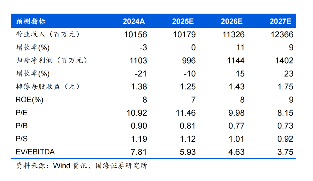 预计公司2025-2027年营业收入为101.79、113.26、123.66亿元,归母净利润分别为9.96、11.44、14.02亿元,对应PE分别11、10、8倍,考虑公司经营稳健,产品结构不断优化,维持“买入”评级。