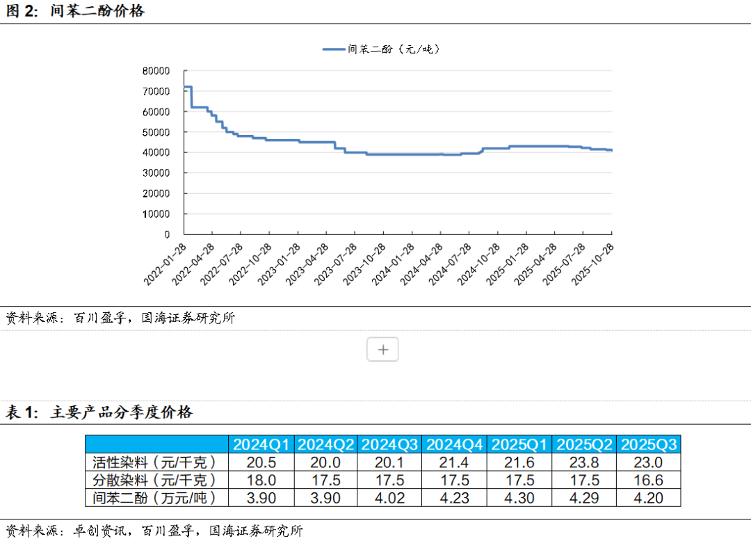 2025年前三季度,公司实现营业收入96.71亿元,同比下降8.85%;实现归属于上市公司股东的净利润13.97亿元,同比增加3.23%。2025年前三季度,染料行业市场竞争依然激烈,国内产能过剩导致染料销售价格一直处于相对底部。据卓创资讯,2025年前三季度,活性染料在上游H酸涨价的成本支撑下,均价为22.8元/千克,同比上涨2.6元/千克,分散染料价格仍有所下滑,均价为17.2元/千克,同比下降0.5元/千克。前三季度,主要中间体间苯二酚价格有所回升,据百川盈孚, 2025年前三季度,间苯二酚均价4.30万元/吨,同比略涨0.33万元/吨。