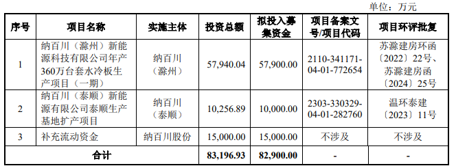 调整情况:募资总额由8.29亿元减少至7.29亿元,缩水1亿元;项目数量由3个变为2个,取消“泰顺生产基地扩产项目”,保留“滁州水冷板项目”和“补充流动资金”。
