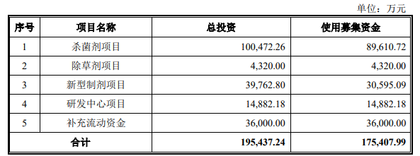 调整情况:募资总额由17.54亿元减少至10.45亿元,大幅缩水7.09亿元;项目数量由5个变为2个,取消"除草剂项目"、"新型制剂项目"和"补充流动资金"。