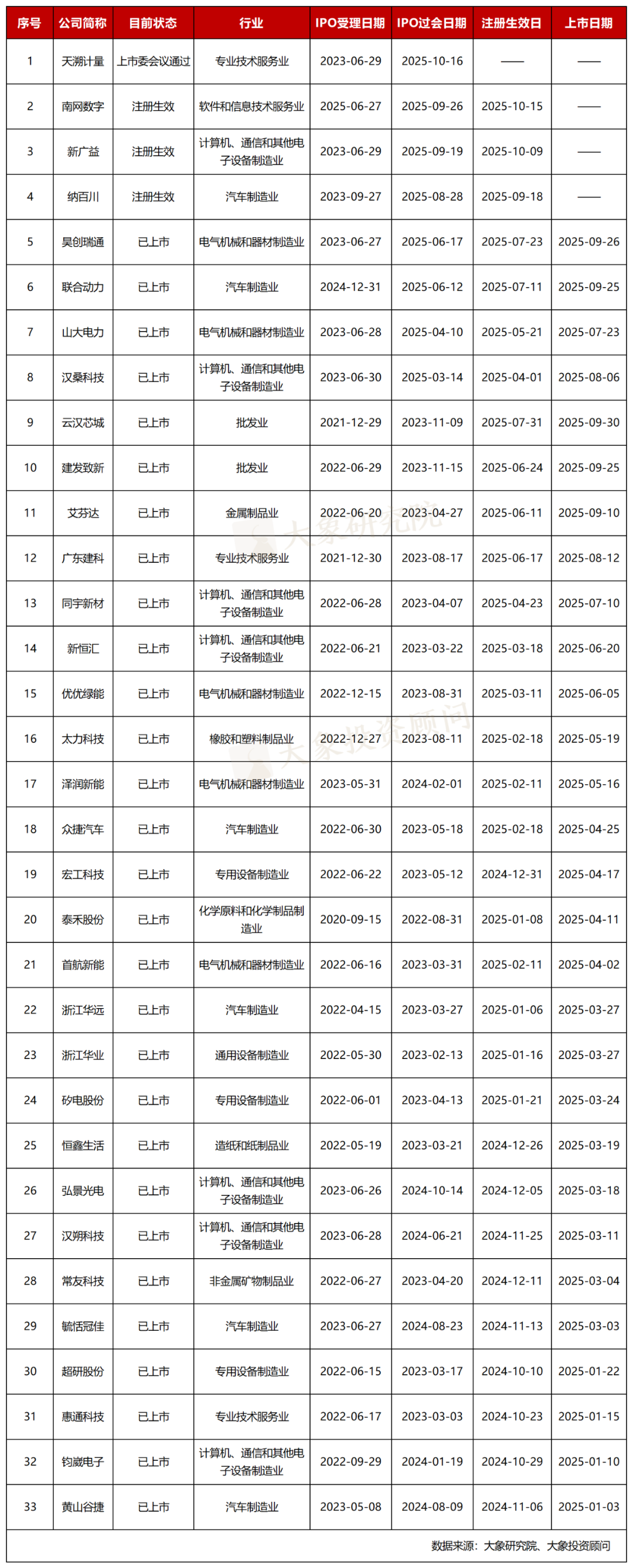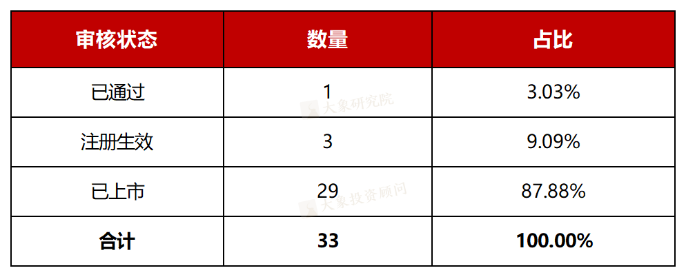据大象君统计,2025年以来,创业板过会及上市项目共计33家,具体审核状态分布情况如下: