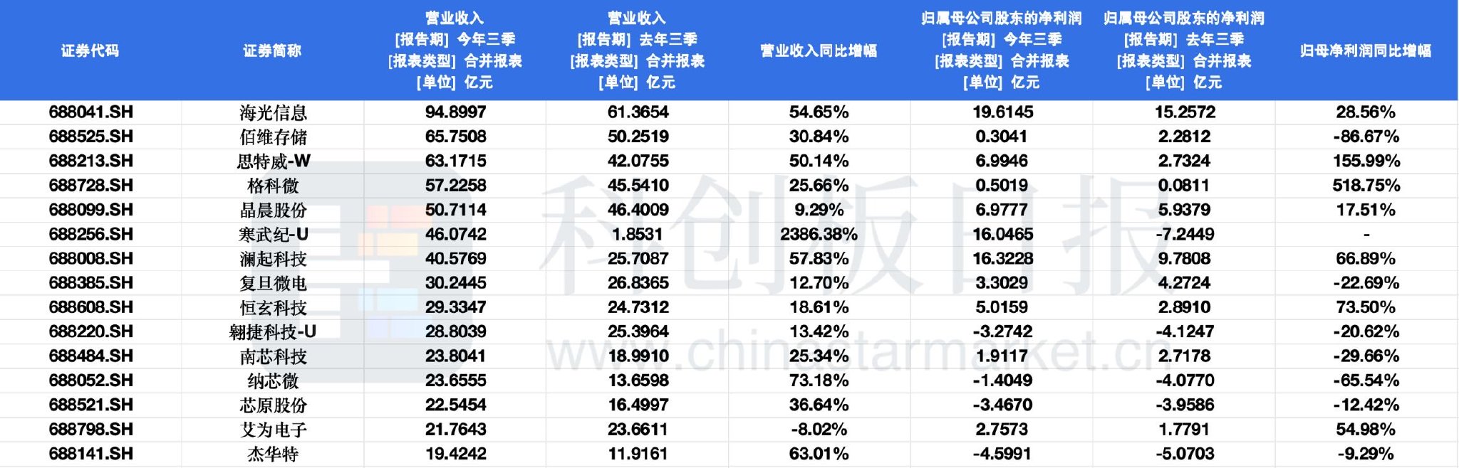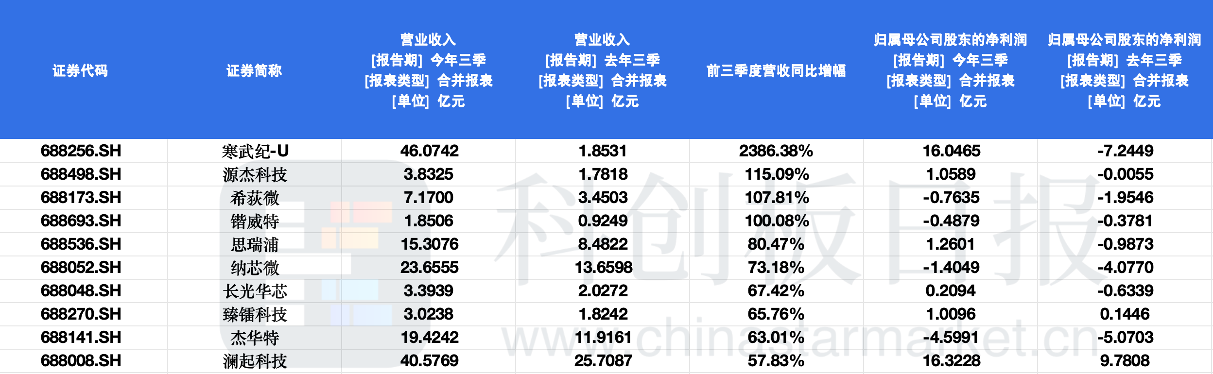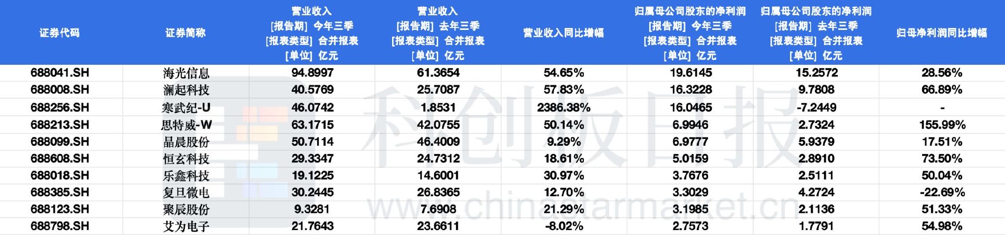 另外,裕太微、翱捷科技、芯原股份、康希通信、希荻微、纳芯微等12家企业前三季度同比减亏;包括寒武纪、源杰科技、盛科通信、唯捷创芯、晶丰明源等在内的10家企业实现扭亏为盈。