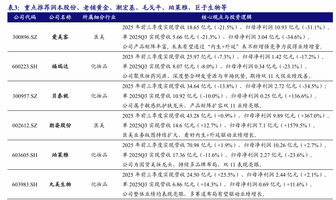 投资主线三(化妆品):关注满足情绪价值和安全成分创新的国货品牌,重点推荐毛戈平、珀莱雅、上美股份、巨子生物、丸美生物、润本股份等;