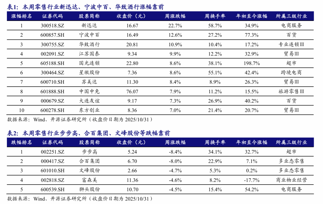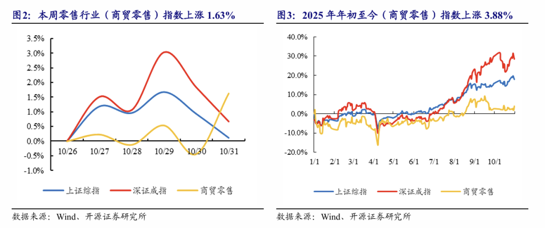 本周(10月27日-10月31日)A股上涨,零售行业指数上涨1.63%。上证综指报收3954.79点,周累计上涨0.11%;深证成指报收13378.21点,周上涨0.67%;本周全部31个一级行业中,表现排名前三位的分别为电力设备、有色金属和钢铁。零售行业指数(参照商贸零售指数)本周报收2325.71点,周涨幅为1.63%,在所有一级行业中位列第8位。2025年年初至今,零售行业指数上涨3.88%,表现弱于大盘(2025年年初至今上证综指累计上涨17.99%)。
