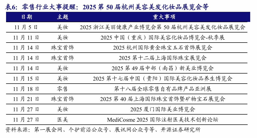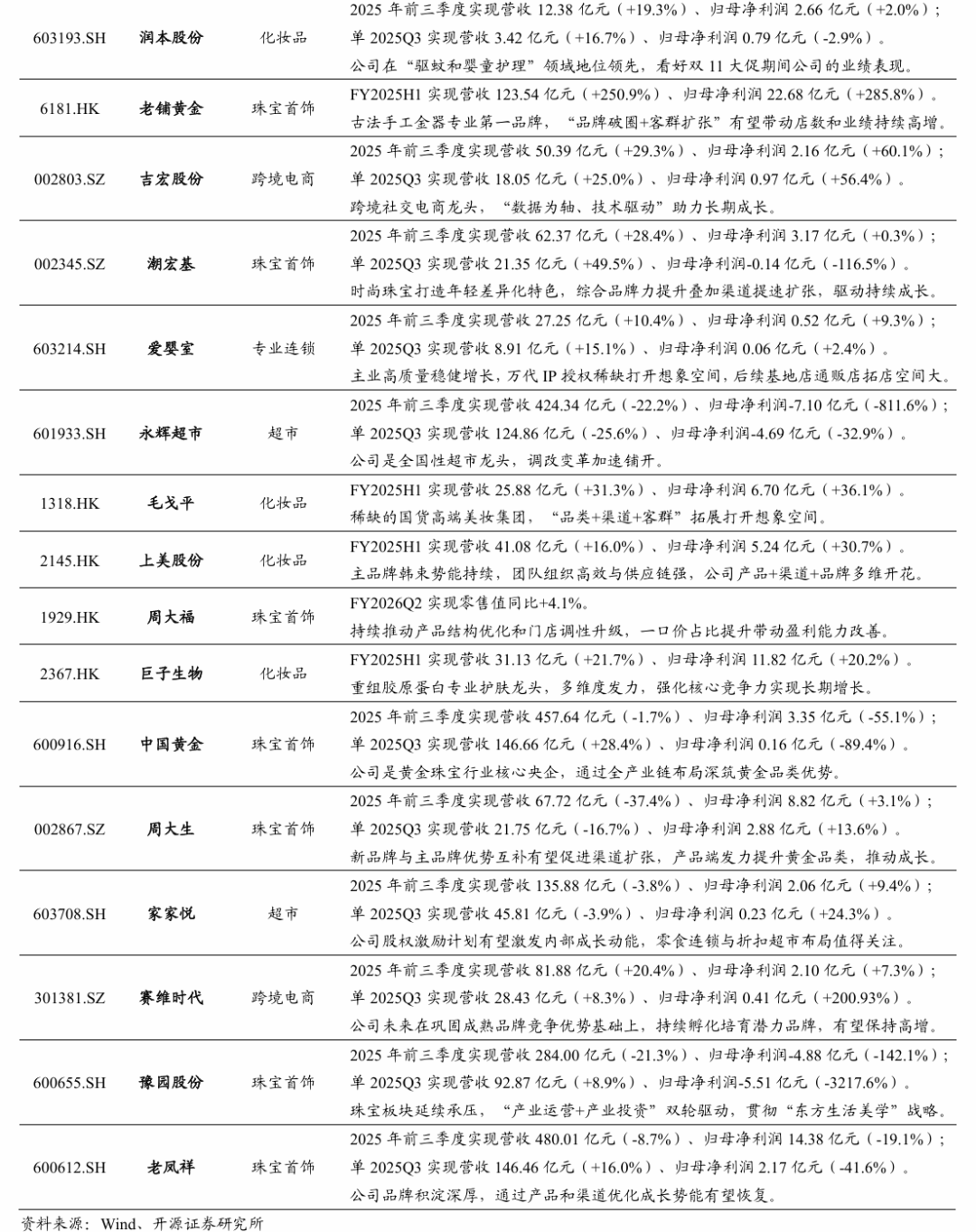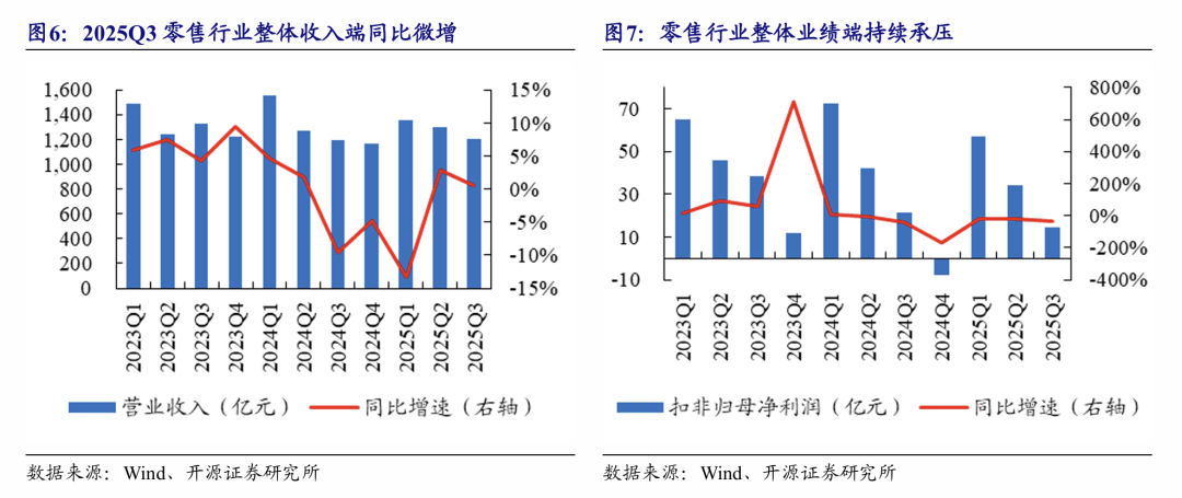 本周A股上市公司三季报已全部披露完毕,我们选取48家代表性上市公司作为样本,对零售行业整体业绩进行梳理分析。2025Q3零售行业整体营收同比+0.5%、扣非归母净利润同比-32.7%,收入端同比微增。具体看,(1)黄金珠宝:2025Q3营收同比+20.0%、扣非归母净利润同比-14.9%。9月以来金价再度急涨,情绪消费兴起叠加金价持续上行,传统渠道逻辑削弱、产品/品牌型公司崛起,具备差异化设计且自带流量的产品具备竞争优势。(2)美容护理:2025Q3营收同比+1.2%、扣非归母净利润同比-12.3%。部分品牌则因外部市场竞争激烈、内部战略定位调整等原因经历短期阶段性降速调整,市场关注点正逐步转向满足情绪价值和安全成分创新的细分赛道,具备较强研发能力、深耕东方美学并全球化拓展布局的公司依然具有长期成长韧性。(3)跨境电商:2025Q3营收同比+9.7%、扣非归母净利润同比+4.4%;我国出海企业背靠制造端优质资源,随海外仓配一体化能力提升和产品力、品牌力升级,有望在新品类、新渠道继续贡献增量;当前关税的系列影响已逐渐明朗,后续有望跟随降息通道进入需求改善阶段,叠加AI智能化布局优势,部分优质企业有望进一步提升市场份额。