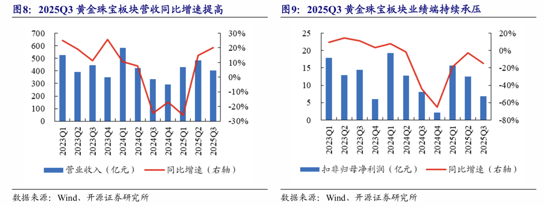 黄金珠宝:2025Q3收入延续高景气,业绩端持续承压。2025Q3黄金珠宝板块整体实现营收401.5亿元(+20.0%),扣非归母净利润6.9亿元(-14.9%);若剔除收入占比较高的老凤祥,板块整体营收255.1亿元(+22.4%),扣非归母净利润4.7亿元(-18.1%)。8月以来金价再度急涨,但由于消费者对高金价接受度逐渐提升,叠加传统黄金品牌转型调整初显成效,终端动销仍有回暖,其中定价类黄金产品热销,行业整体经营趋势呈现边际好转。