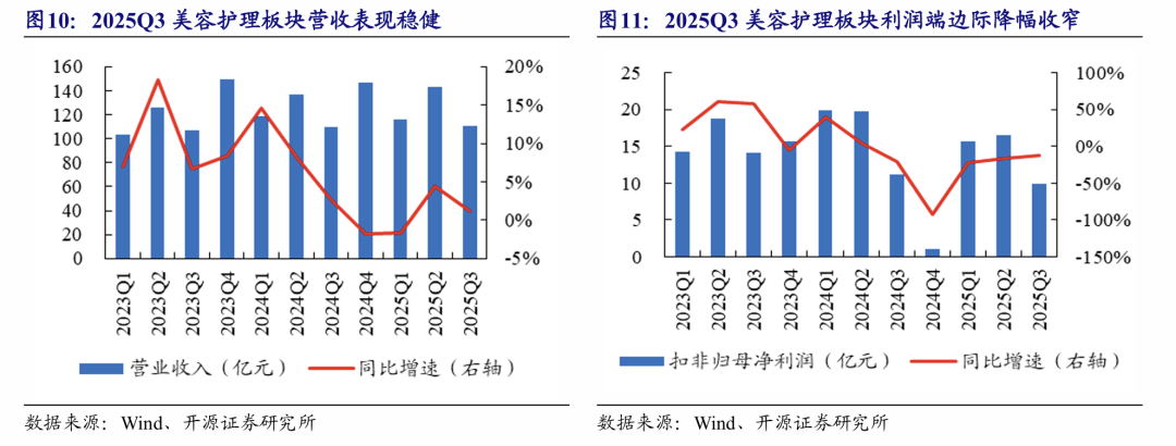 美容护理:2025Q3收入表现稳健,利润端降幅进一步收窄。2025Q3美容护理板块整体实现营收110.9亿元(+1.2%),扣非归母净利润9.8亿元(-12.3%);若剔除爱美客、锦波生物、朗姿股份三家医美标的,则对应的品牌化妆品板块营收与扣非归母净利润分别同比+2.2%/+20.2%。2025年三季度整体有所回暖,虽行业流量红利期已基本结束,板块竞争加剧,但上海家化、水羊股份等龙头品牌方营收、利润端表现强势依旧;部分品牌则因外部市场竞争激烈、内部战略定位调整等原因经历短期阶段性降速调整。市场关注点正逐步转向满足情绪价值和安全成分创新的细分赛道,具备较强研发能力、深耕东方美学并全球化拓展布局的公司依然具有长期成长韧性。