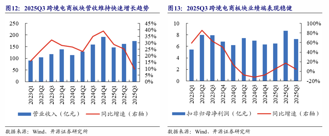 跨境电商板块:2025Q3收入增长趋缓,业绩端稳健向上。2025Q3跨境电商板块整体实现营收174.6亿元(+9.7%),扣非归母净利润7.3亿元(+4.4%)。对美贸易受政策等因素影响承压,东南亚电商市场发展向好。一方面,我国出海企业背靠制造端优质资源,随海外仓配一体化能力提升和产品力、品牌力升级,有望在新品类、新渠道继续贡献增量;另一方面,当前关税的系列影响已逐渐明朗,后续有望跟随降息通道进入需求改善阶段,部分优质企业或将迎来经营上行趋势,叠加龙头企业拥有智能化布局的规模优势,有望进一步提升市场份额。