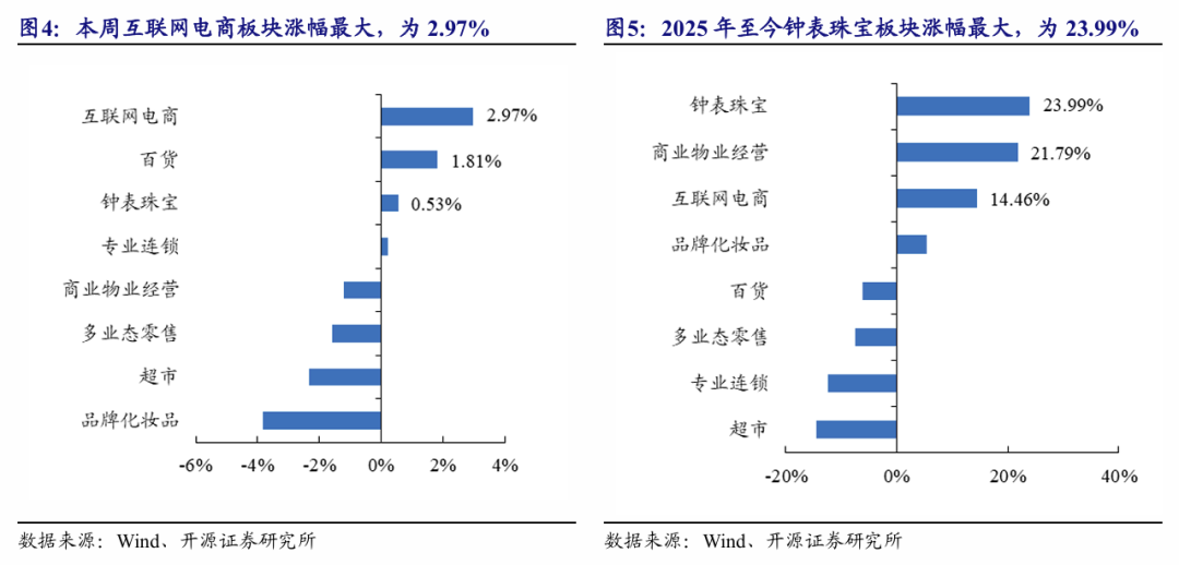 零售各细分板块中,互联网电商板块本周涨幅最大;2025年年初至今,钟表珠宝板块涨幅最大。在零售行业各主要细分板块(我们依据二级行业分类,选择较有代表性的超市、百货、多业态零售、专业连锁、商业物业经营、互联网电商、钟表珠宝和品牌化妆品8个细分板块)中,本周4个子板块上涨,其中互联网电商板块涨幅最大,周涨幅为2.97%;2025年全年来看,钟表珠宝板块年初至今累计涨幅为23.99%,在零售行业各细分板块中领跑。