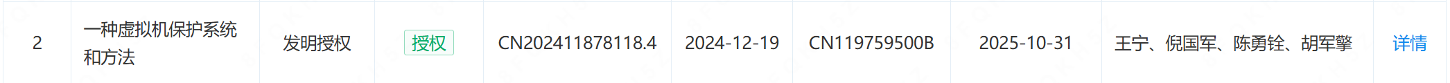 此外,公开信息显示,10月31日,英方软件新获得一项发明授权,专利名为“一种虚拟机保护系统和方法”。
