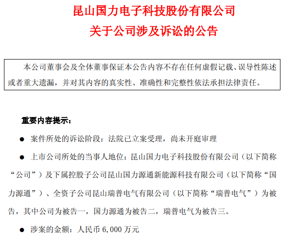 公司及控股子公司国力源通、全资子公司瑞普电气为被告,其中公司为被告一,国力源通为被告二,瑞普电气为被告三。涉案的金额6000万元,截至公告日,该案件尚未开庭审理。