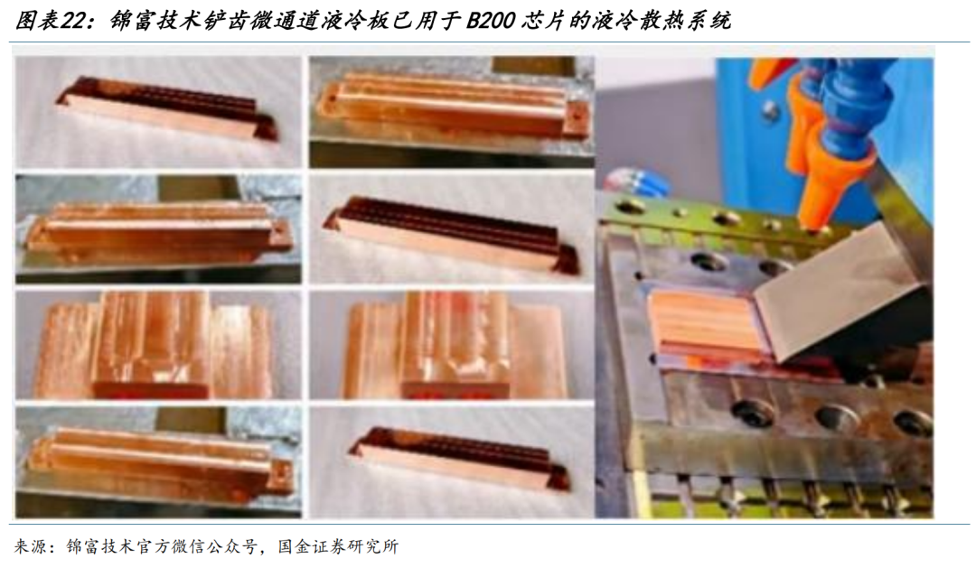 微通道液冷板成为新趋势,3D打印优势进一步放大:根据锦富技术(维权)信息,其开发的0.08mm微通道液冷板已获得某台湾客户的订单,已用于B200芯片的液冷散热系统,针对下一代B300芯片的适配方案也已完成多轮送样测试,反馈良好,进入生产准备阶段,通过微通道技术进一步增强散热性能大势所趋。一般将当量直径低于1mm的散热器定义为微通道散热器,由于微通道液冷板涉及极小尺寸的立体复杂结构制造(尤其是要实现仿生流道设计),传统铲齿、微铣削、微电火花加工、微冲压等制造工艺均存在较大限制,受到材料厚度和几何结构复杂程度的限制,难以加工出深宽比大和结构复杂的沟槽,3D打印的加工优势将进一步放大,并且可避免焊接过程导致微通道结构尺寸改变的问题。目前产业主要通过铲齿工艺进行加工,后续或向3D打印技术过渡。